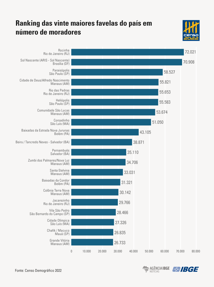 Segundo o Censo 2022, a Rocinha, no Rio de Janeiro (RJ), é a favela mais populosa do país, com 72.021 moradores, e ainda a que apresentou o maior número de domicílios particulares permanentes ocupados (30.371 unidades). Já a segunda favela mais populosa é o Sol Nascente, em Brasília (DF), com 70.908 habitantes.