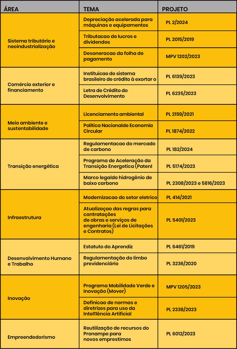 Ao todo, a CNI destaca 17 temas em tramitação no Congresso como prioritários. Vice-presidente da República e ministro do Desenvolvimento, Indústria, Comércio e Serviços, Geraldo Alckmin destacou algumas dessas medidas como relevantes, como o projeto de lei 2/24, que trata da depreciação acelerada de máquinas e equipamentos — e que visa reduzir o pagamento de tributos.